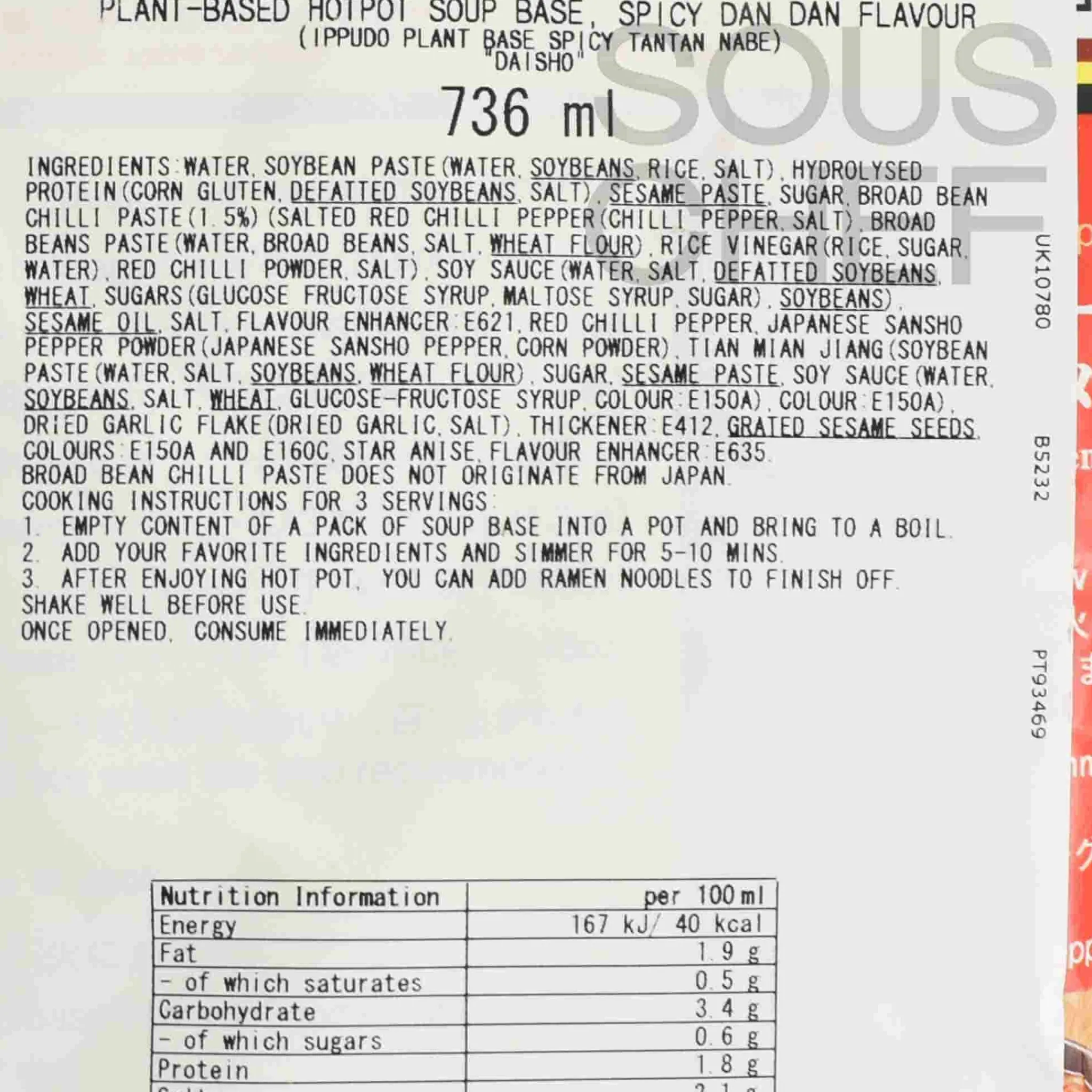 Product formulations and details may change. For the latest ingredients and allergen information always check product packaging prior to consumption. Ingredients: Water, soybean paste (water, soybeans, rice, salt), hydrolysed protein (corn gluten, defatted soybeans, salt), sesame paste, sugar, broad bean chilli paste (1.5%) (salted red chilli pepper (chilli pepper, salt), broad beans paste (water, broad beans, salt, wheat flour), rice vinegar (rice, sugar, water), red chilli powder, salt), soy sauce (water, salt, defatted soybeans, wheat, sugars (glucose fructose syrup, maltose syrup, sugar), soybeans), sesame oil, salt, flavour enhancer: e621, red chilli pepper, japanese sansho pepper powder (japanese sansho pepper, corn powder), tian mian jiang (soybean paste (water, salt, soybeans, wheat flour), sugar, sesame paste, soy sauce (water, soybeans, salt, wheat, glucose-fructose syrup, colour: e150a), colour: e150a), dried garlic flake (dried garlic, salt), thickener: e412, grated sesame seeds, colours: e150a and e160c, star anise, flavour enhancer: e635.