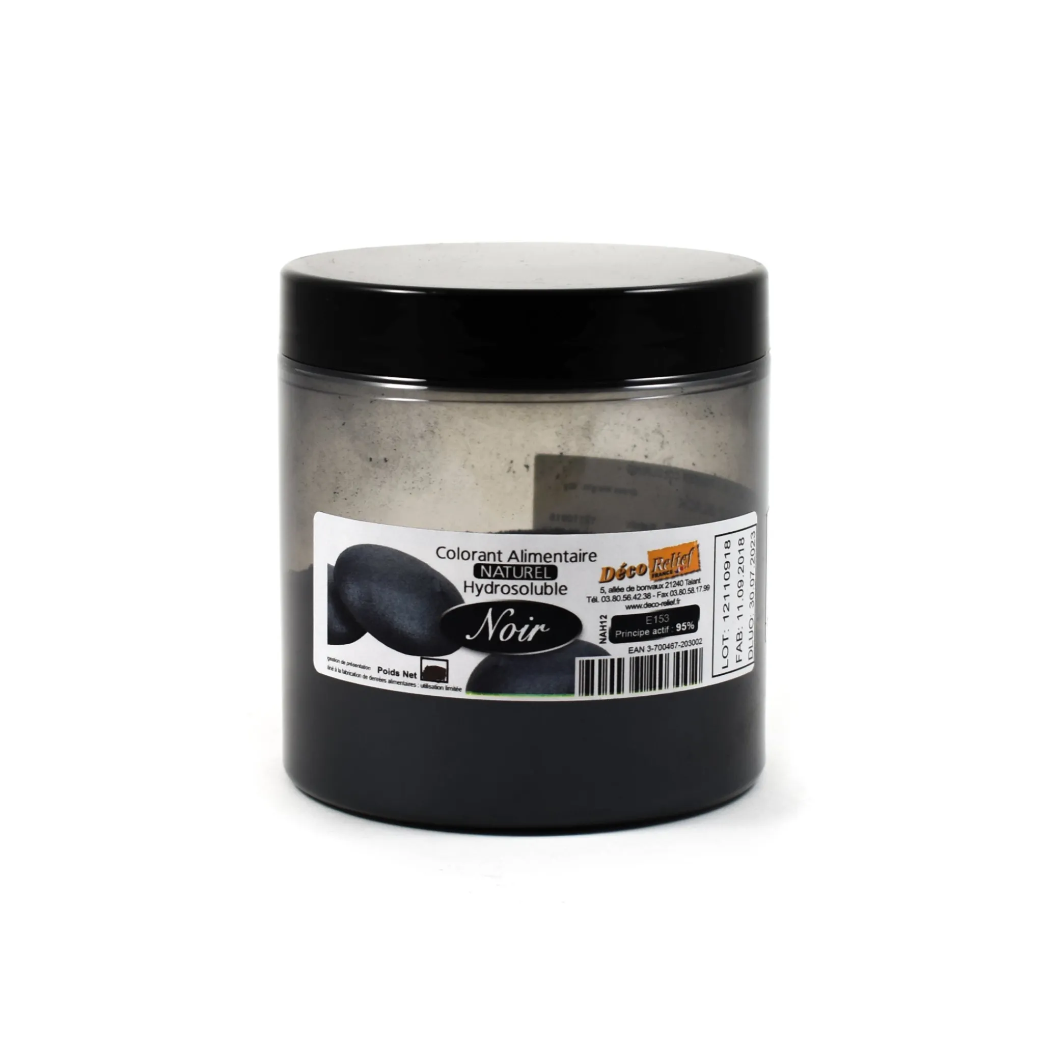 The natural black colouring is made from charcoal, produced by burning vegetable matter. Natural black food colour is perfect for colouring blamanges, macarons, meringues or even pasta dough. The natural black food colour can also be mixed with a little water, and used to paint patterns onto royal icing when decorating cakes.