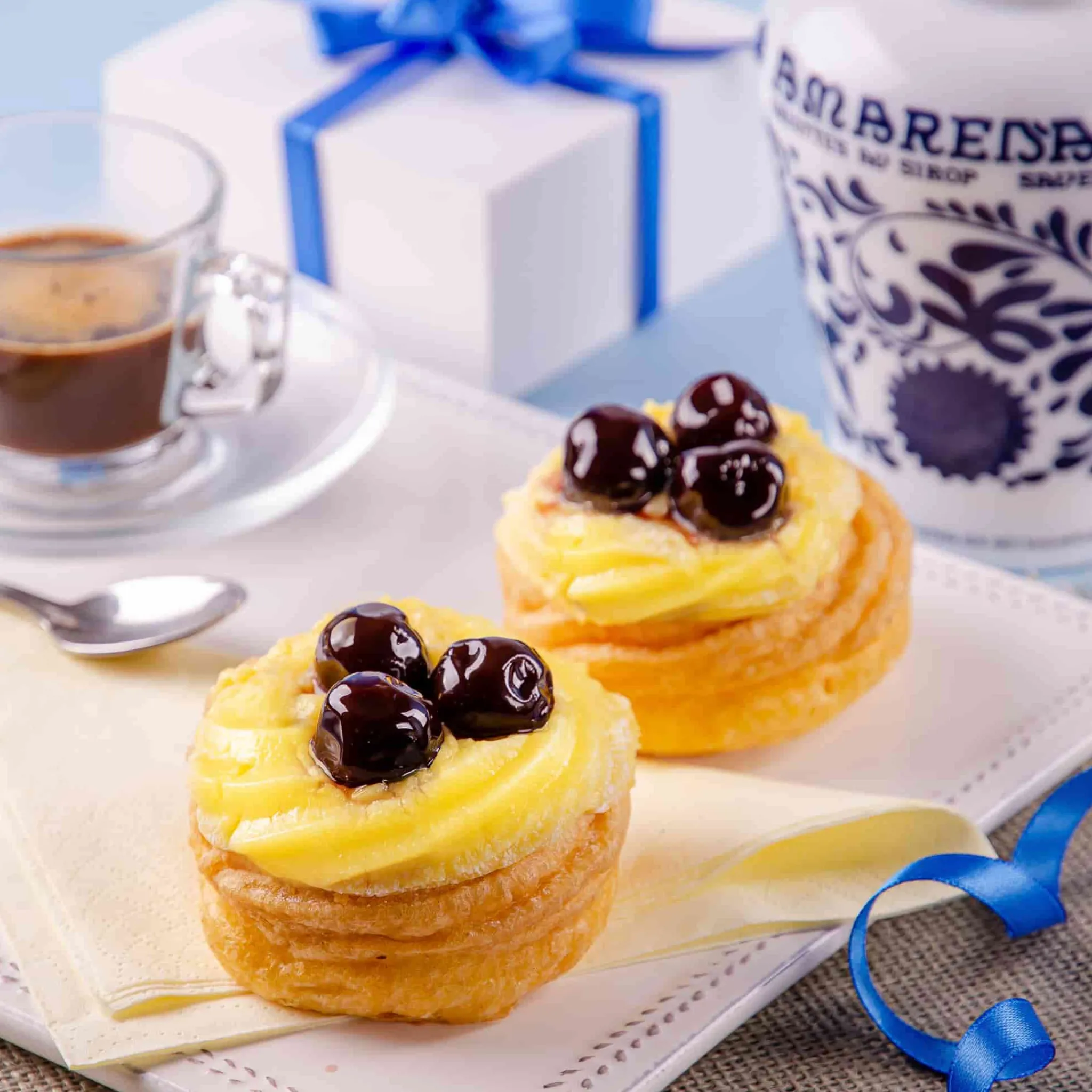 Amarena cherries are small black cherries that grow wild in the Italian cities of Bologna and Modena. They are commonly gently cooked and preserved in sugar syrup, then used as a dessert topping.