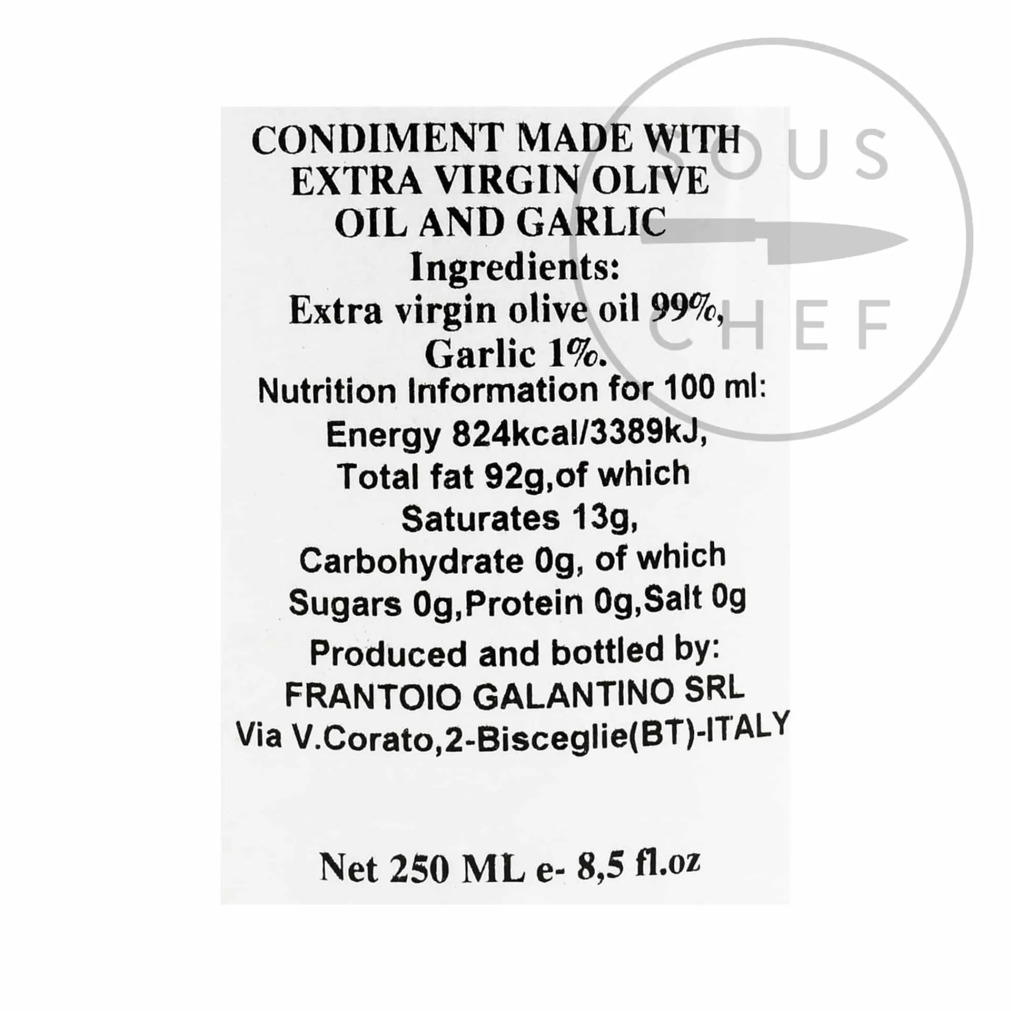 Product formulations and details may change. For the latest ingredients and allergen information always check product packaging prior to consumption. Ingredients: extra virgin olive oil (99%), garlic (1%).