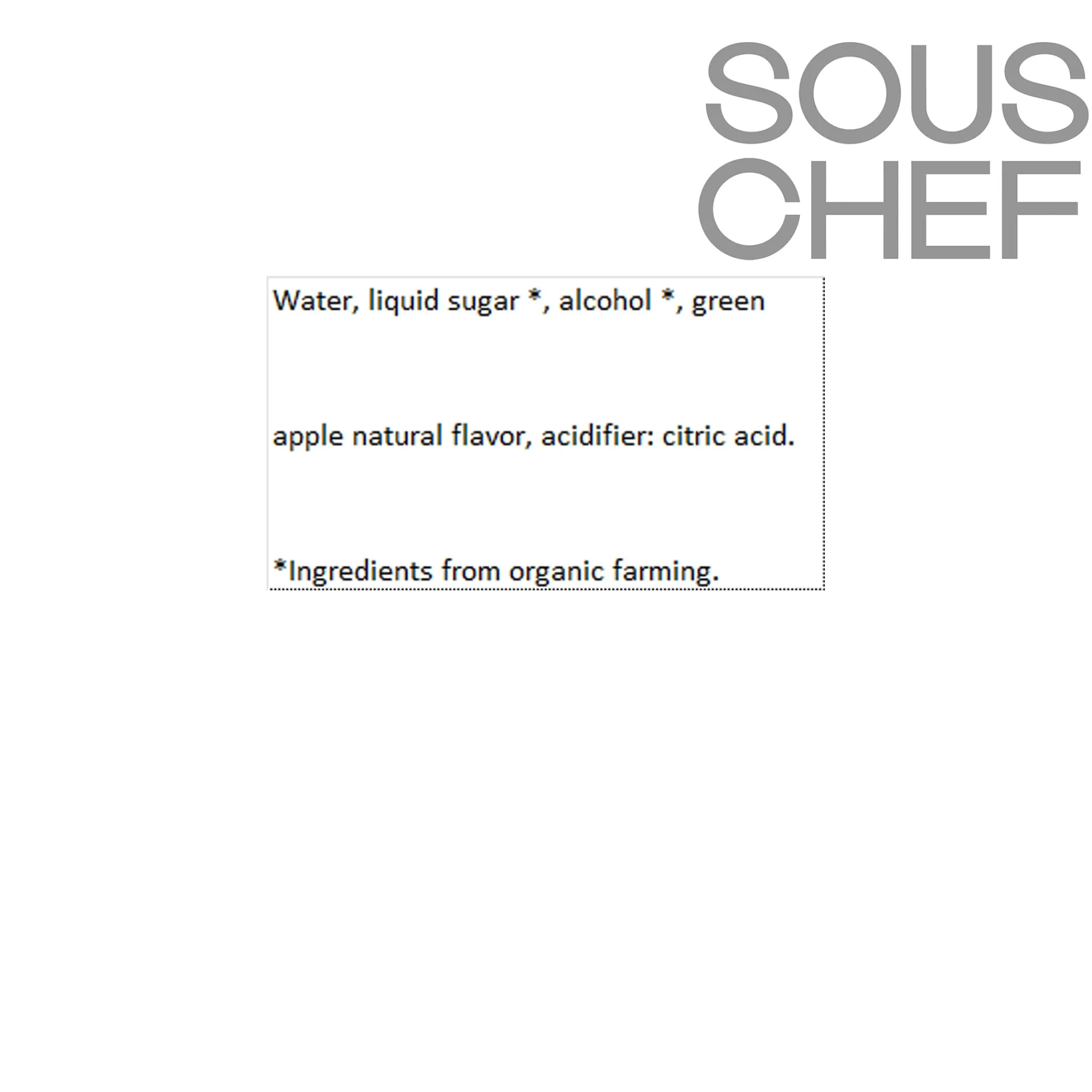 Product formulations and details may change. For the latest ingredients and allergen information always check product packaging prior to consumption. Ingredients: Water, liquid sugar *, alcohol *, green apple natural flavor, acidifier: citric acid * ingredients from organic farming