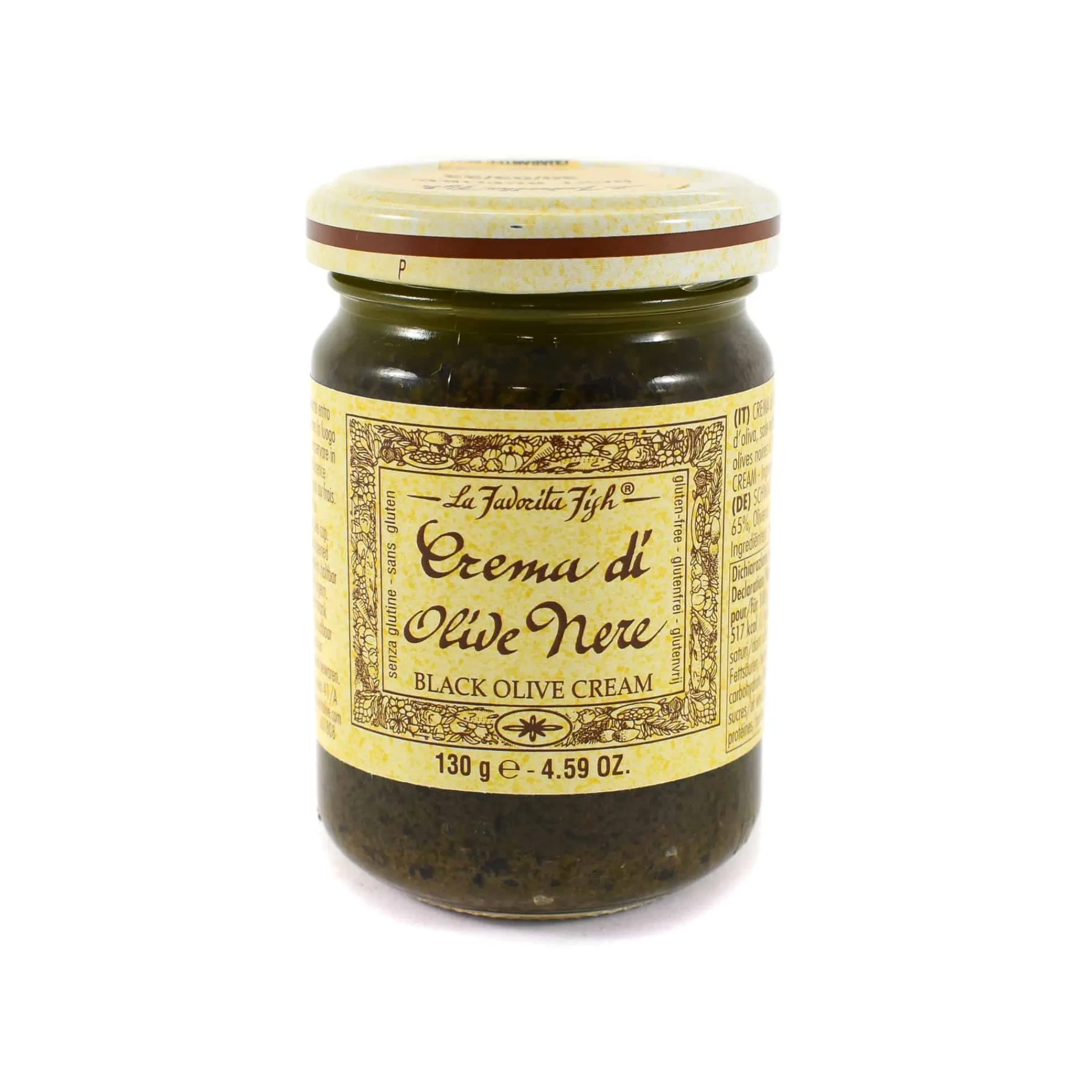 La Favorita black olive cream is a punchy ready-made-sauce for stirring through cooked pasta, spreading over crunchy bread or using as a dip for crostini. Made with only three ingredients – black olives, olive oil, and sea salt – this cream is intense in flavour.
