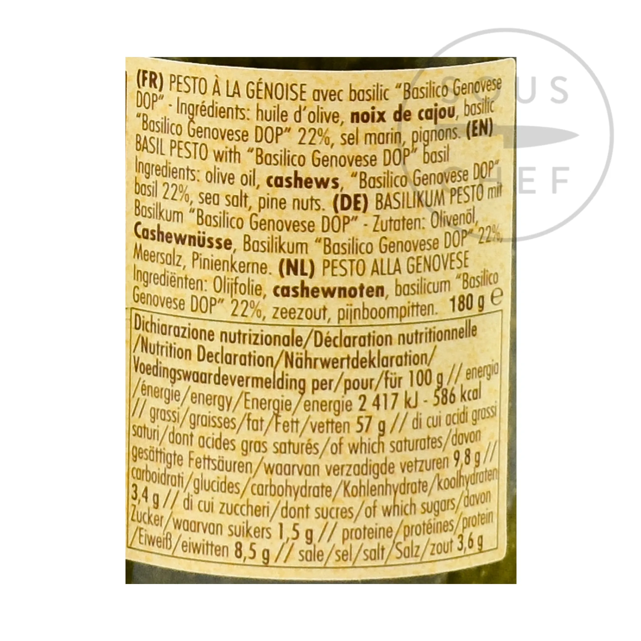 Product formulations and details may change. For the latest ingredients and allergen information always check product packaging prior to consumption. Ingredients: olive oil, cashews, ‘Basilico Genovese DOP’ basil (22%), sea salt, pine nuts. Contains allergens: nuts.