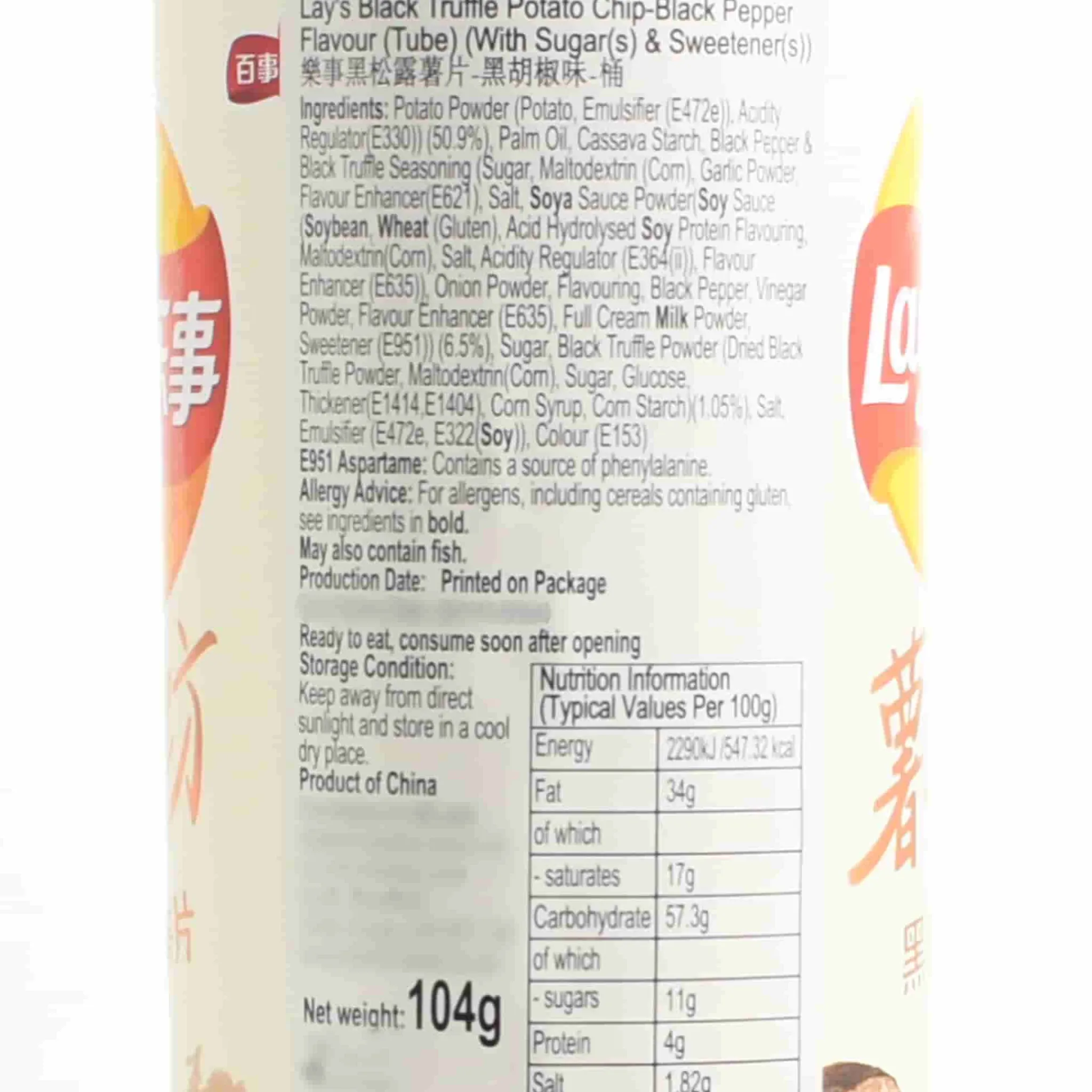 Product formulations and details may change. For the latest ingredients and allergen information always check product packaging prior to consumption. Ingredients: Potato powder (potato, emulsifier (e472e)), acidity regulator(e330)) (50.9%), palm oil, cassava starch, black pepper & black truffle seasoning (sugar, maltodextrin (corn), garlic powder, flavour enhancer(e621), salt, soya sauce powder(soy sauce (soybean, wheat (gluten), acid hydrolysed soy protein flavouring, maltodextrin (corn), salt, acidity regulator (e364(ii)), flavour enhancer (e635)), onion powder, flavouring, black pepper, vinegar powder, flavour enhancer (e635), full cream milk powder, sweetener (e951)) (6.5%), sugar, black truffle powder (dried black truffle powder, maltodextrin(corn), sugar, glucose, thickener (e1414, e1404), corn syrup, corn starch) (1.05%), salt, emulsifier (e472e, e322 (soy)), colour (e153) e951 aspartame: contains a source of phenylalanine.