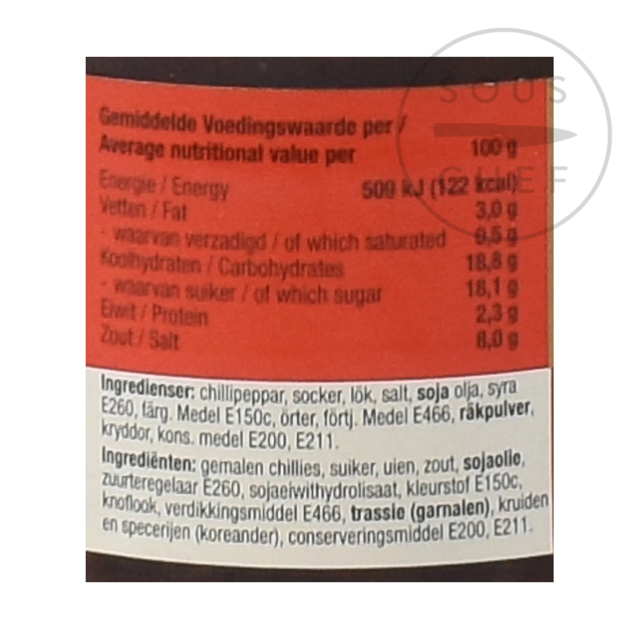 Product formulations and details may change. For the latest ingredients and allergen information always check product packaging prior to consumption. Ingredients: Ground chillies, sugar, onions, salt, soy oil, food acid E260, soy protein hydrolyzate, food color E150c, garlic, thickener E466, shrimp-powder, spices and herbs (coriander), preservative E200, E211