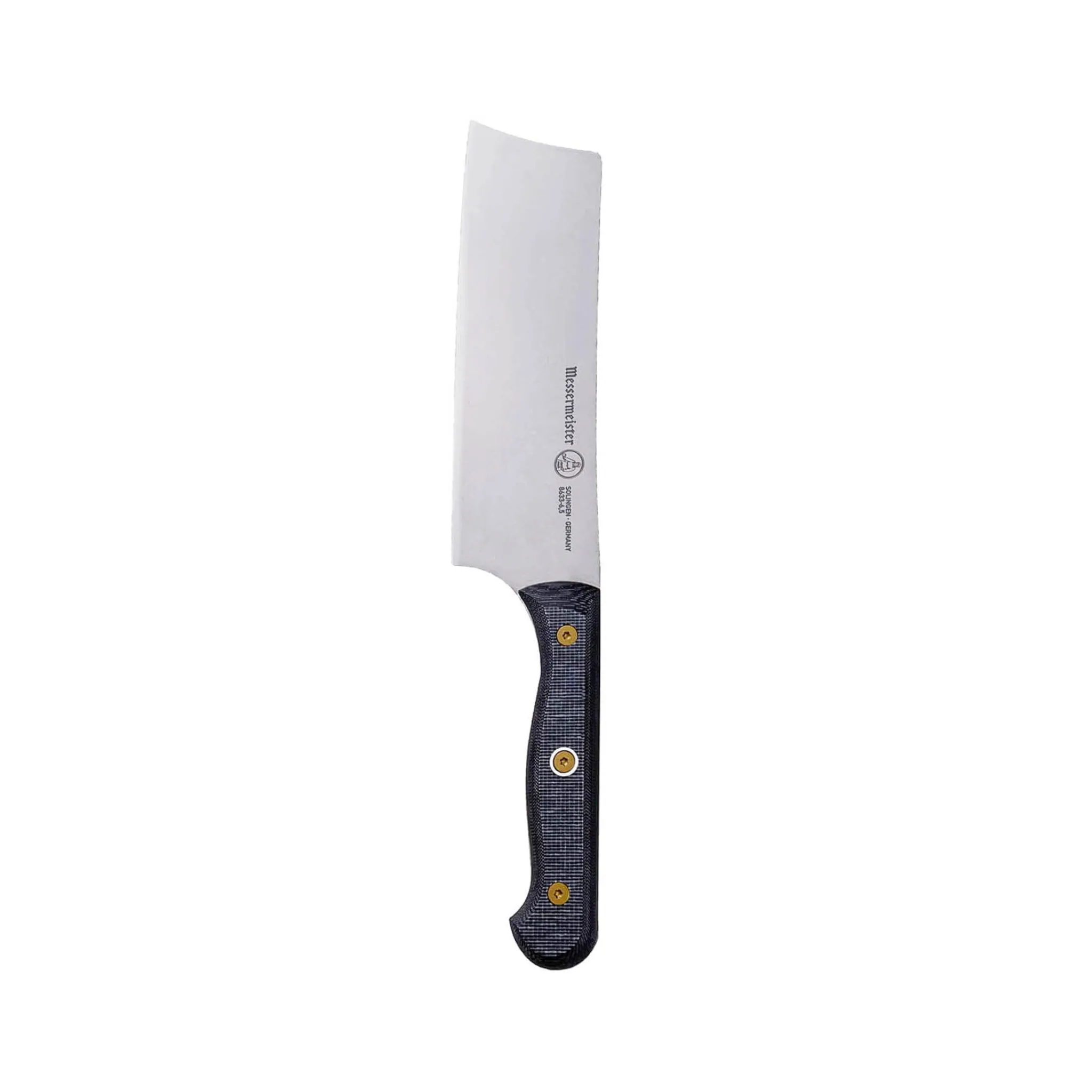 Messermeister’s custom chef nakiri style knife makes light work of chopping hard vegetables. With a thin blade and straight cutting edge, this cleaver-like blade is excellent for slicing and shredding cabbages, onions and potatoes.