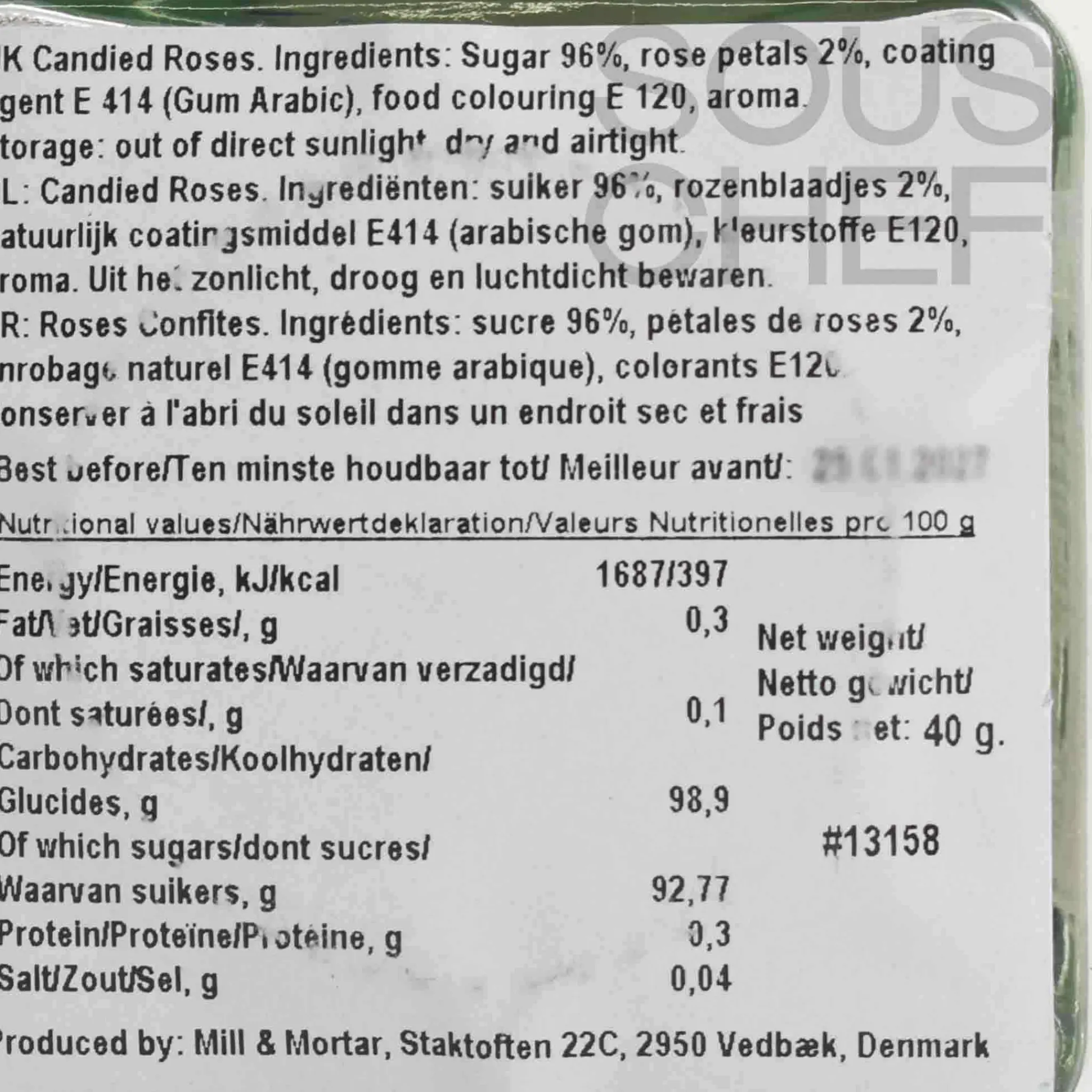 Product formulations and details may change. For the latest ingredients and allergen information always check product packaging prior to consumption. Ingredients: Sugar, rose petals (2%), stabilizer e412 (guar gum), colorants e120, e132, flavor