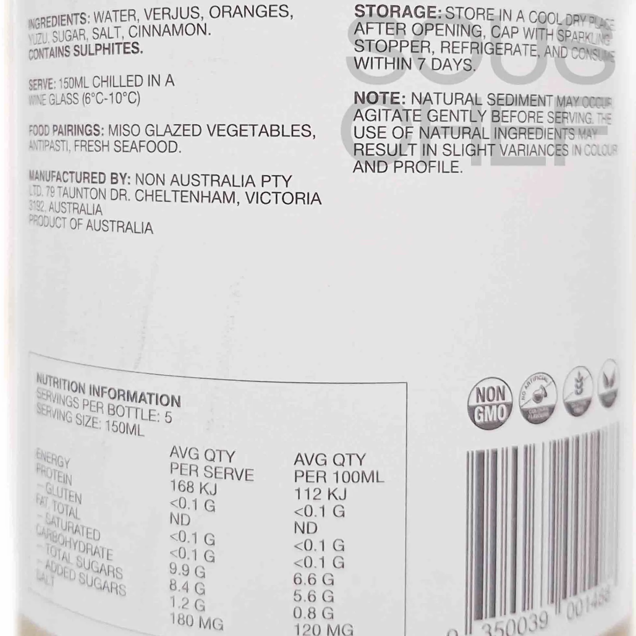 Product formulations and details may change. For the latest ingredients and allergen information always check product packaging prior to consumption. Ingredients: Yuzu, whole oranges, cinnamon, murray river salt, organic cane sugar, verjus, water, contains sulphites.