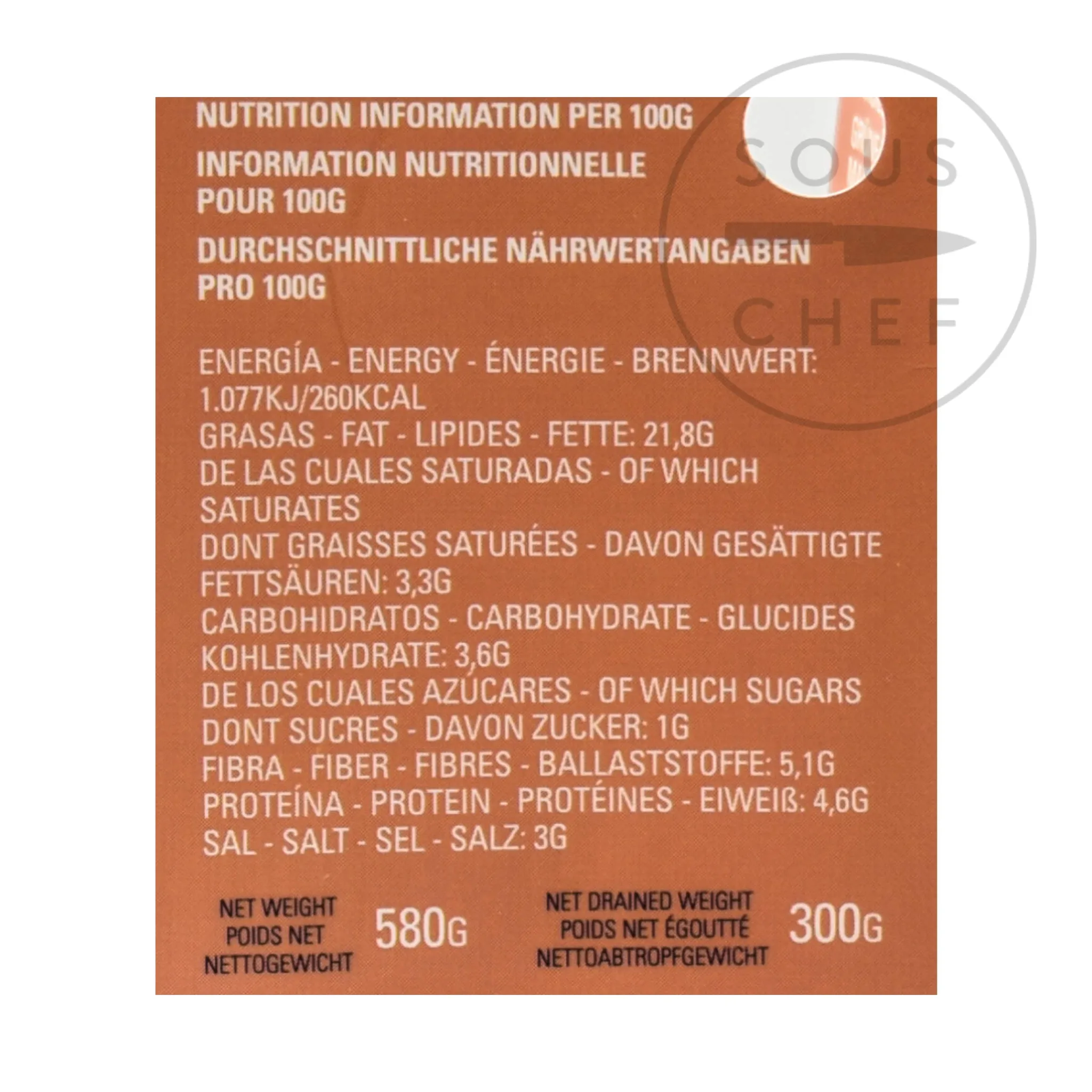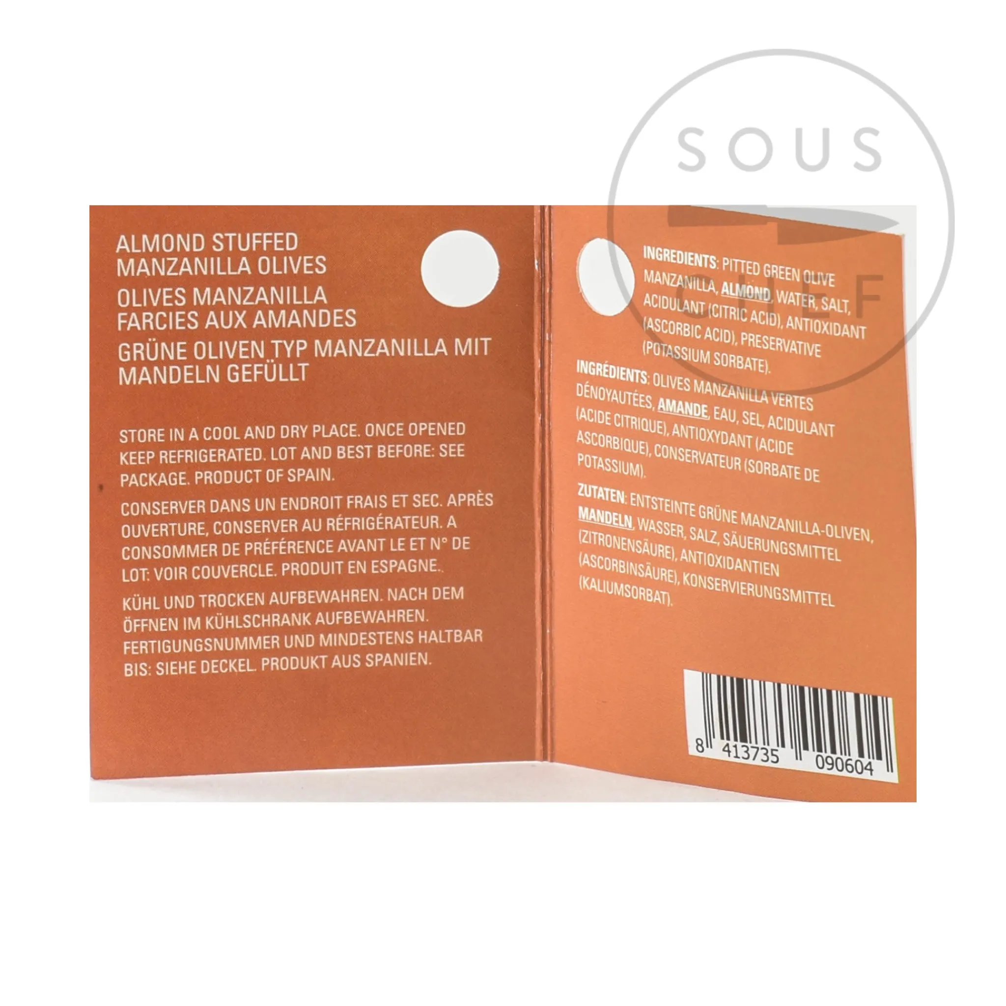 Product formulations and details may change. For the latest ingredients and allergen information always check product packaging prior to consumption. Ingredients: Pitted green olive manzanilla (31%), almond (20%), salt, acidulant (E330), preservative (E202), flavour enhancer (E621), antioxidant (E300).