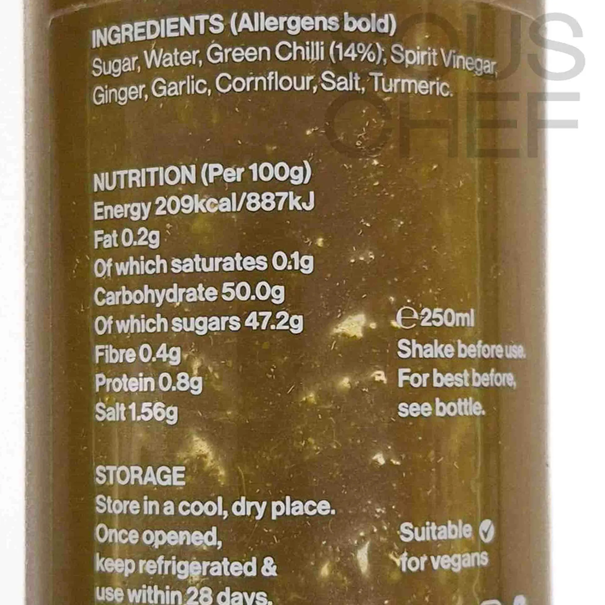 Product formulations and details may change. For the latest ingredients and allergen information always check product packaging prior to consumption. Ingredients: Green chilli, long green chilli, garlic, salt, sugar, ginger, dried turmeric, white vinegar, cornflour
