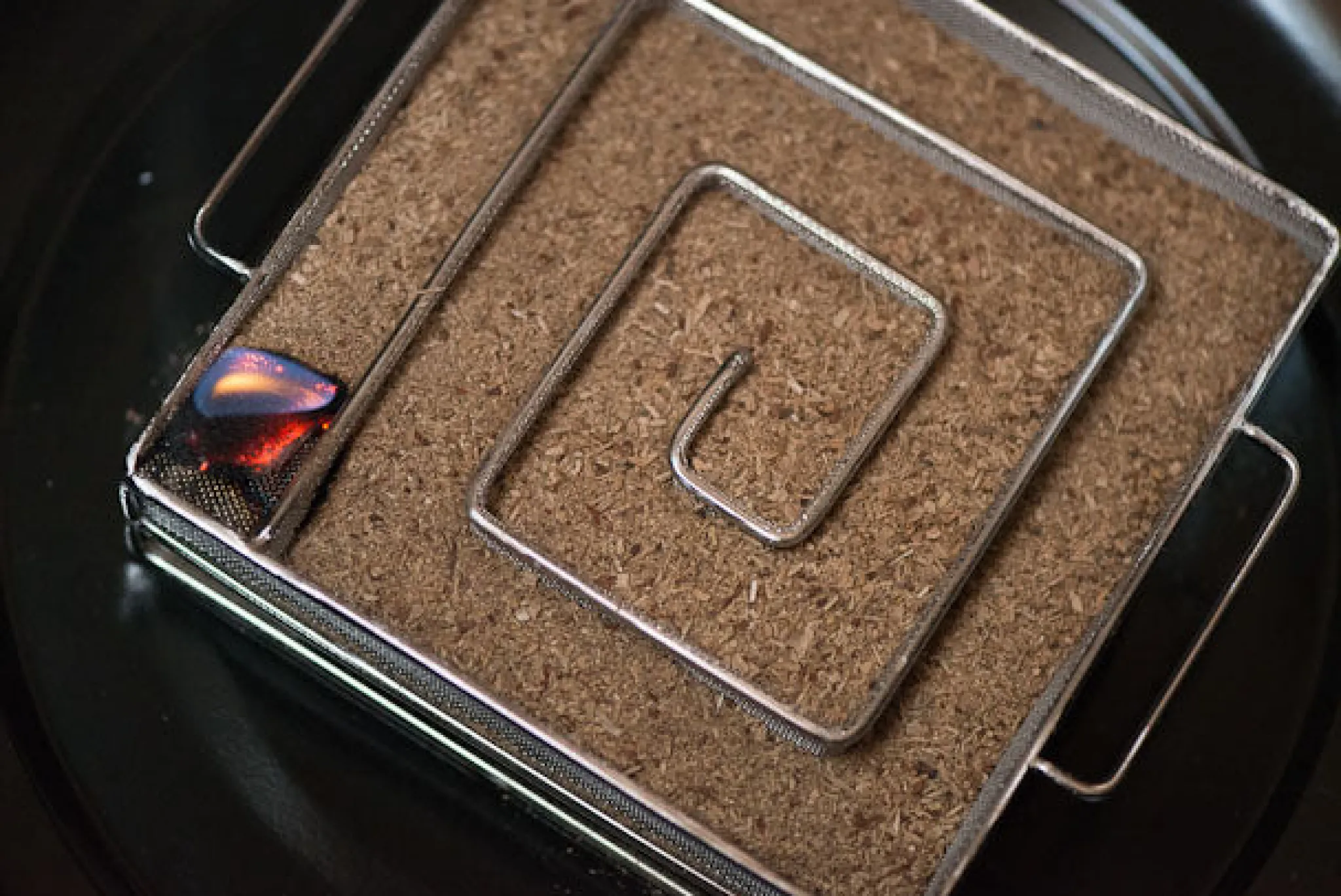 Next, fill the smoking tray with the oak wood dust, and light the corner. The smoke will wind its way through the maze over the course of ten hours, releasing a steady stream of smoke. Add spices or herbs, or use different flavoured wood dust to scent the smoke and pair it with specific foods. Try everything from haddock, to home-smoked salmon, bacon, brisket, ribs and cheeses.