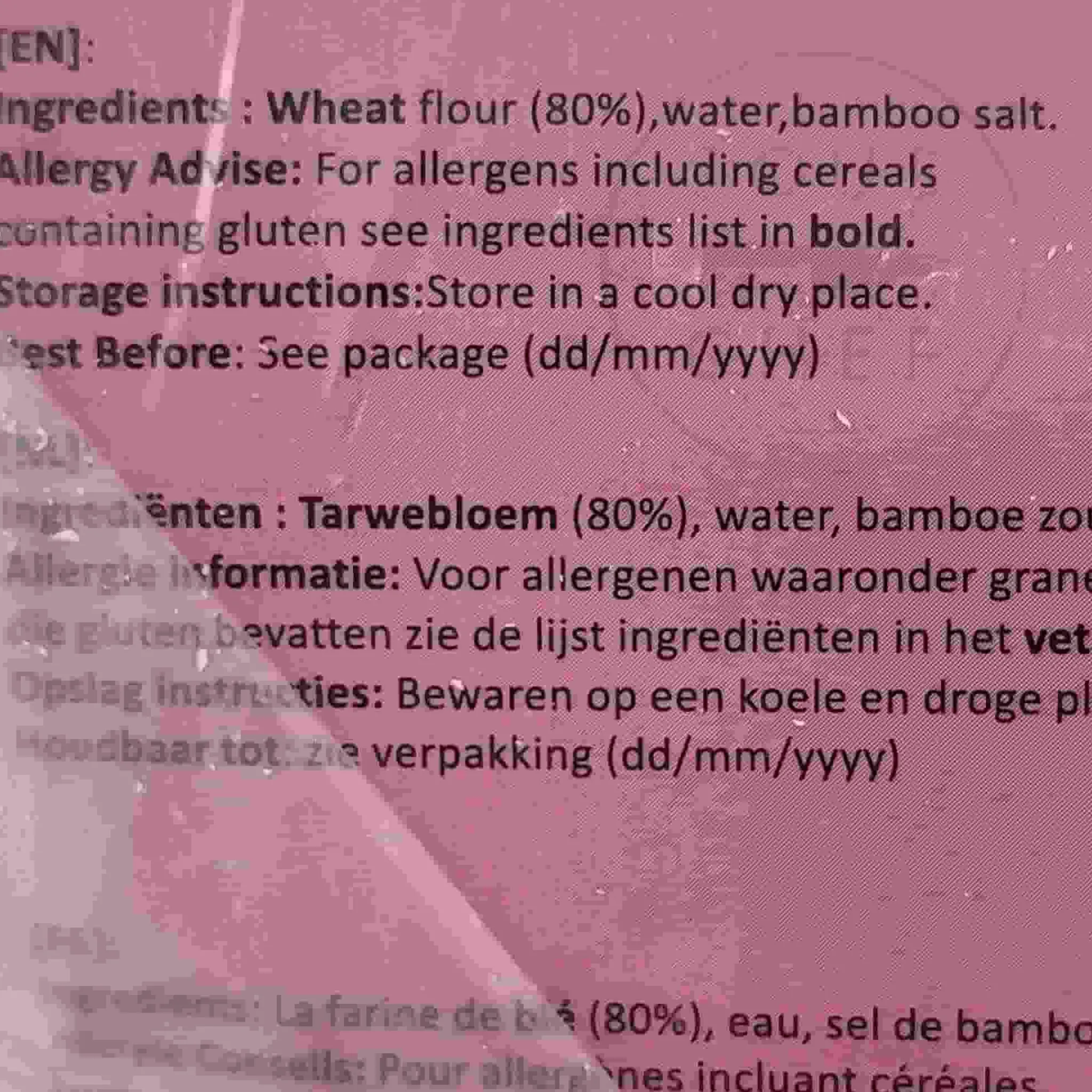 Product formulations and details may change. For the latest ingredients and allergen information always check product packaging prior to consumption. Ingredients: wheat flour (80%), water, bamboo salt