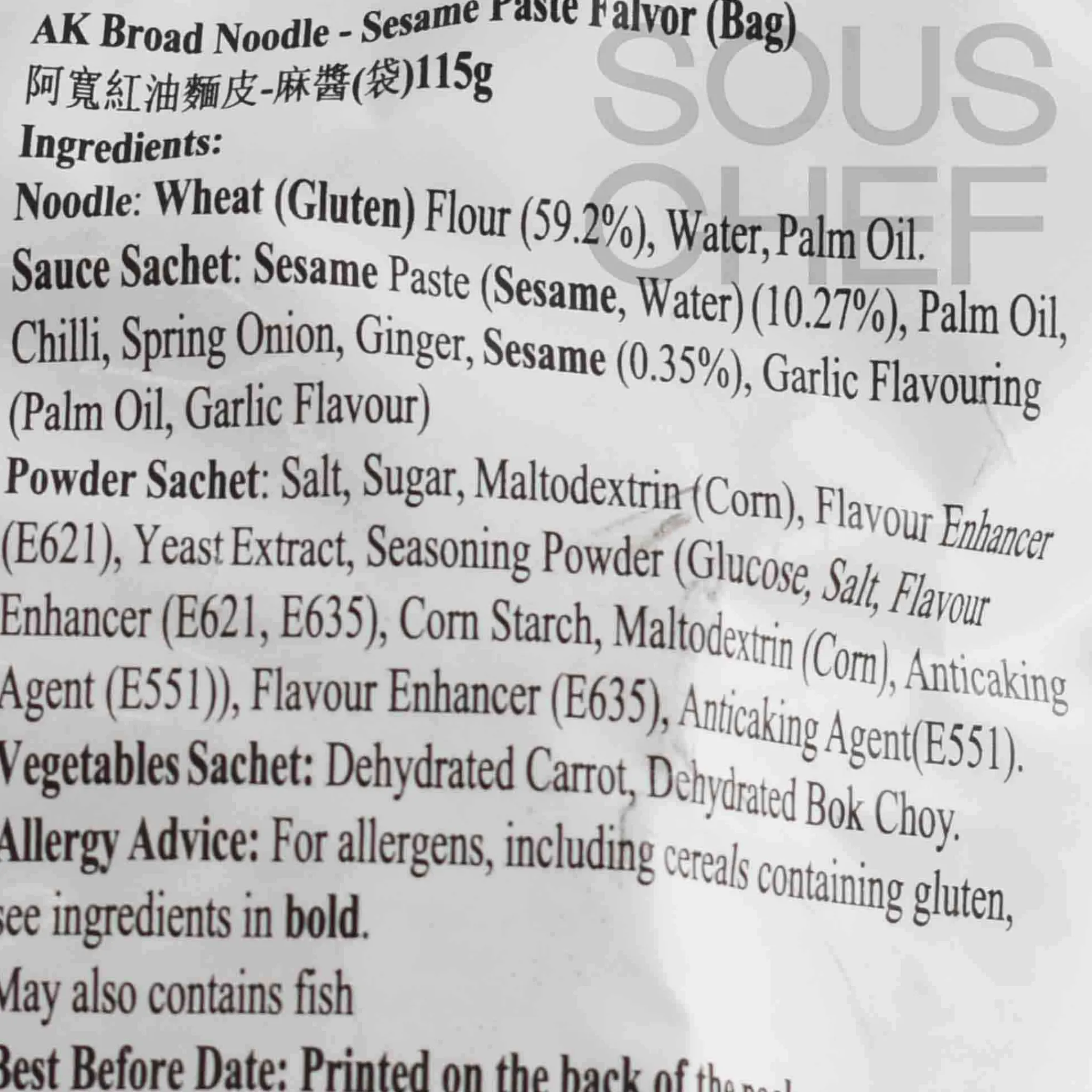 Product formulations and details may change. For the latest ingredients and allergen information always check product packaging prior to consumption. Ingredients: Noodle: wheat (gluten) flour (59.2%), water, palm oil. Sauce sachet: sesame paste (sesame, water) (10.27%), palm oil, chilli, spring onion, ginger, sesame (0.35%), garlic flavouring (palm oil, garlic flavour). Powder sachet: salt, sugar, maltodextrin (corn), flavour enhancer (e621), yeast extract, seasoning powder (glucose, salt, flavour enhancer (e621, e635), corn starch, maltodextrin (corn), anticaking agent (e551)), flavour enhancer (e635), anticaking agent (e551). Vegetables sachet: dehydrated carrot, dehyrated bok choy.