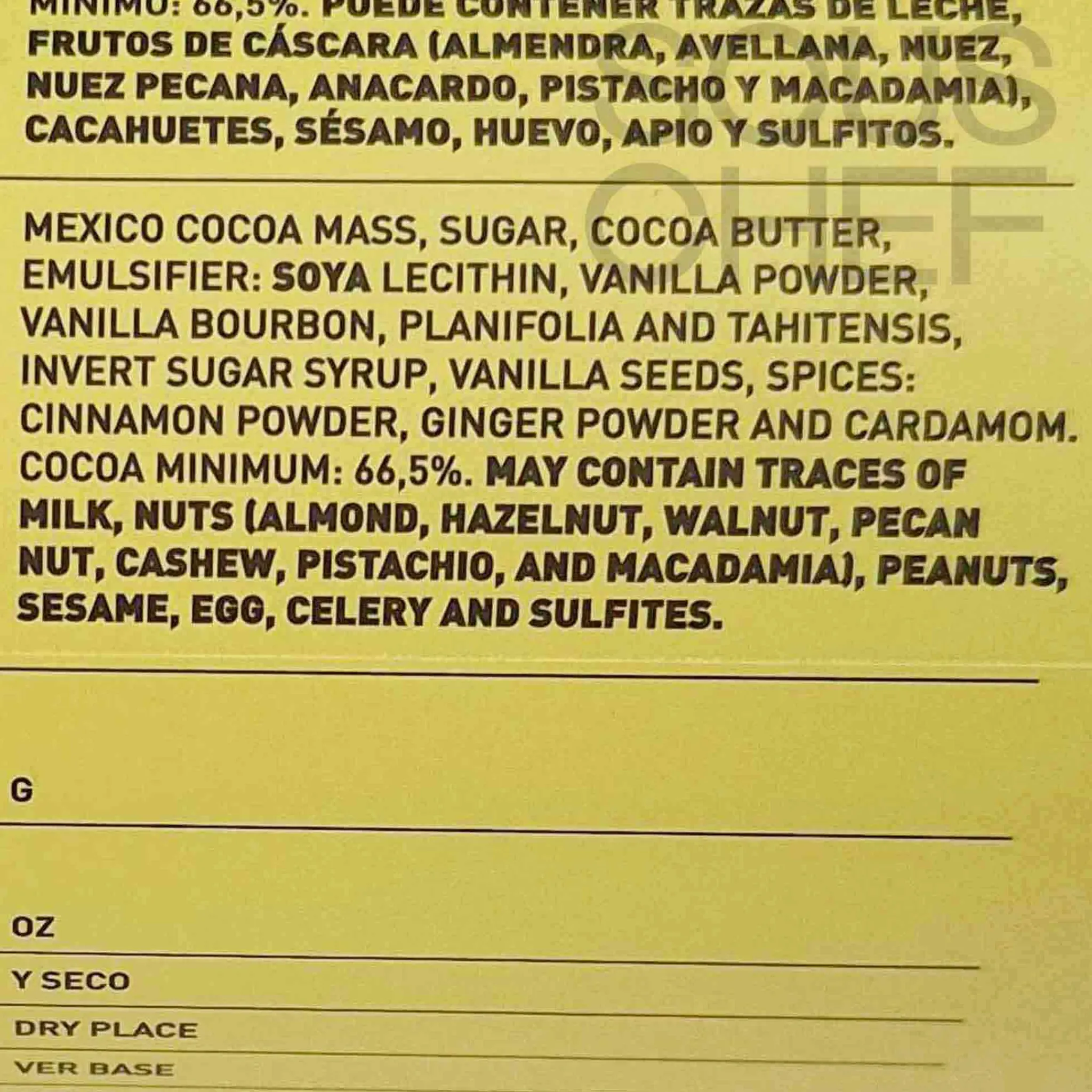 Ingredients: Mexico cocoa mass, sugar, cocoa butter, emulsifier: soya lecithin, vanilla powder, vanilla bourbon, planifolia and tahitensis, invert sugar syrup, vanilla seeds, spices: cinnamon powder, ginger powder and cardamom. cocoa minimum: 66%.