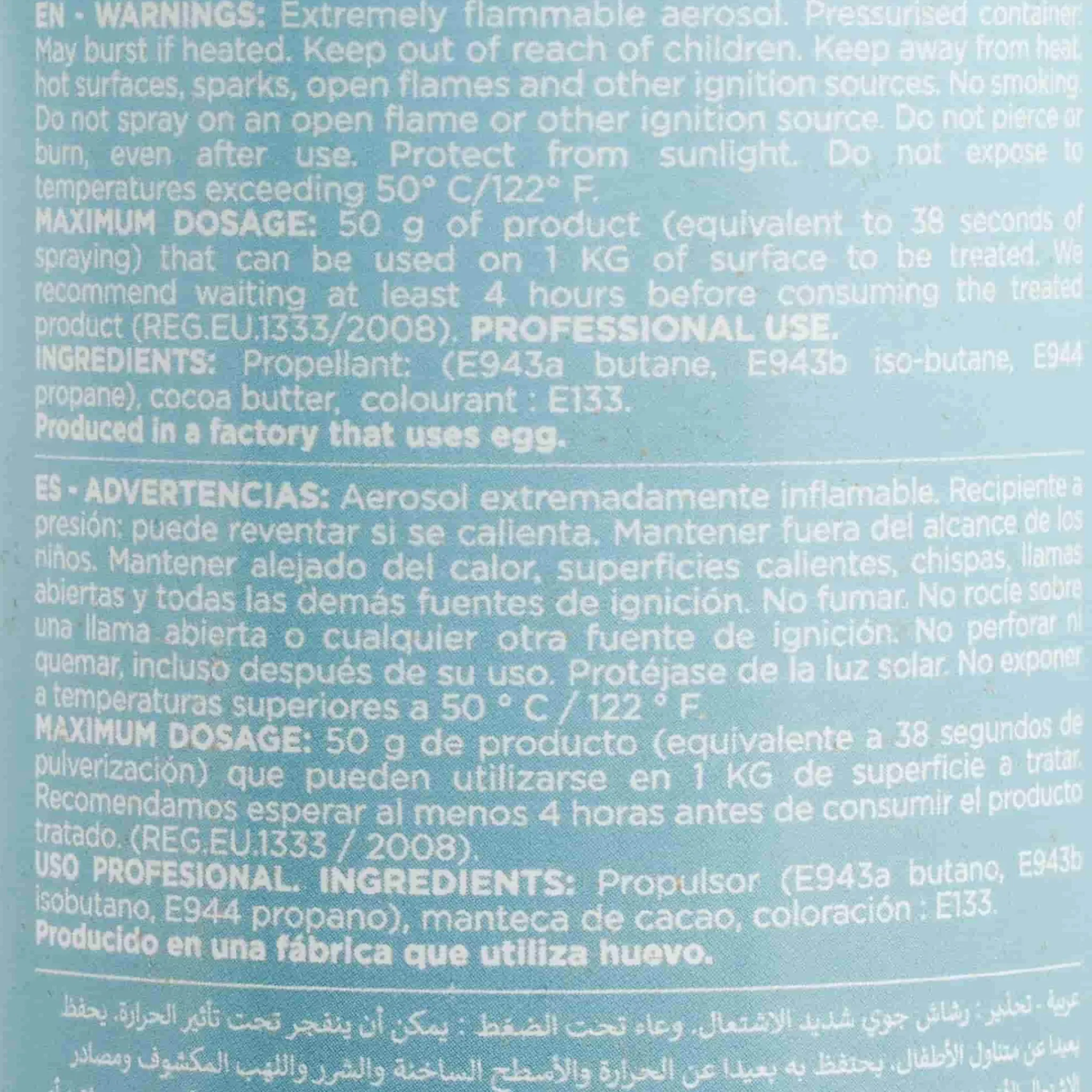 Product formulations and details may change. For the latest ingredients and allergen information always check product packaging prior to consumption. Ingredients: Propellant (e943a n-butane, e943b iso-butane, e944 propane), cocoa butter, e133.
