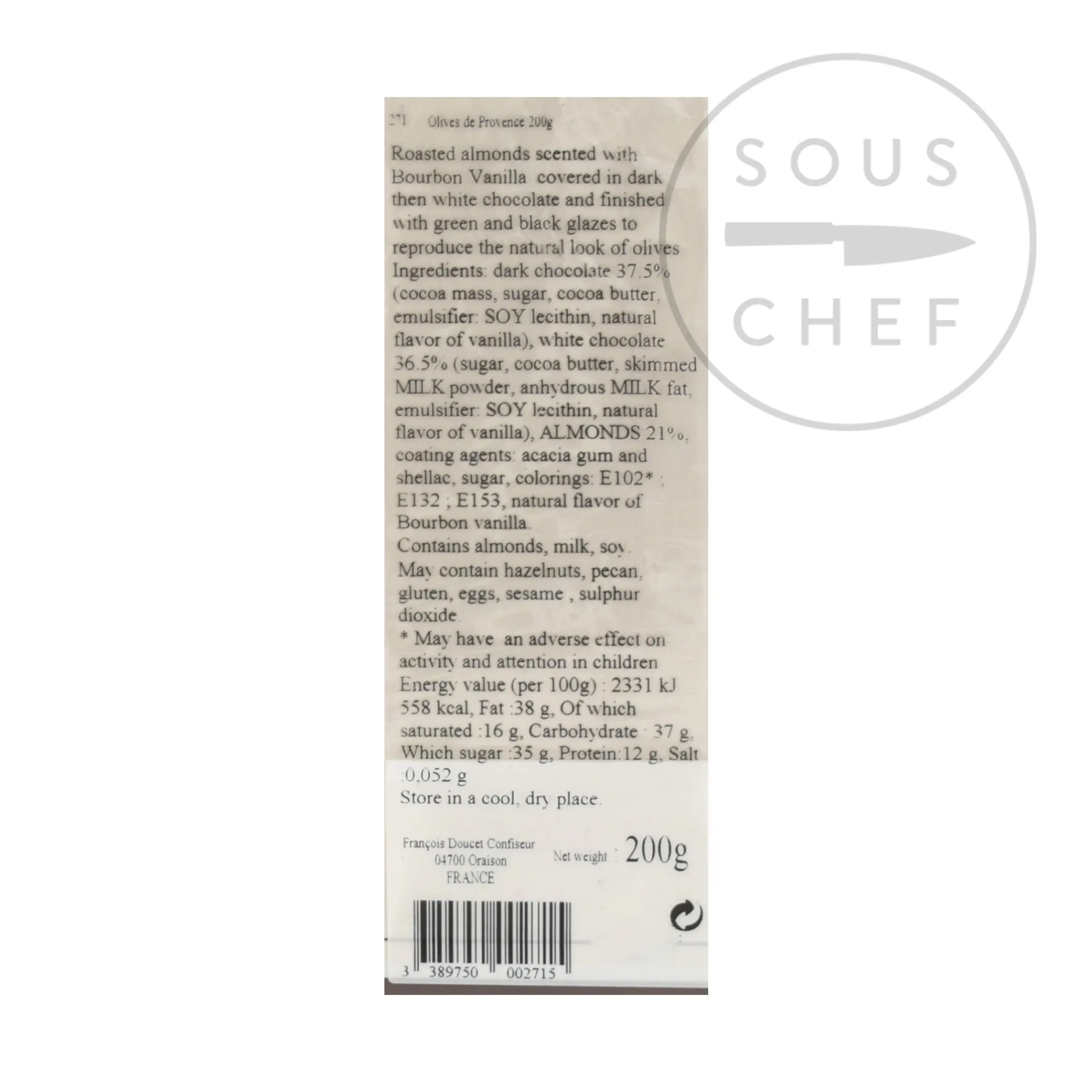 The Francois Doucet chocolate olives are a dark and glossy selection of roasted almonds from Provence, scented with Bourbon vanilla and covered in dark chocolate. They are finished with a glazing of white chocolate painted in dark green and black hues to resemble the olives of Provence.
