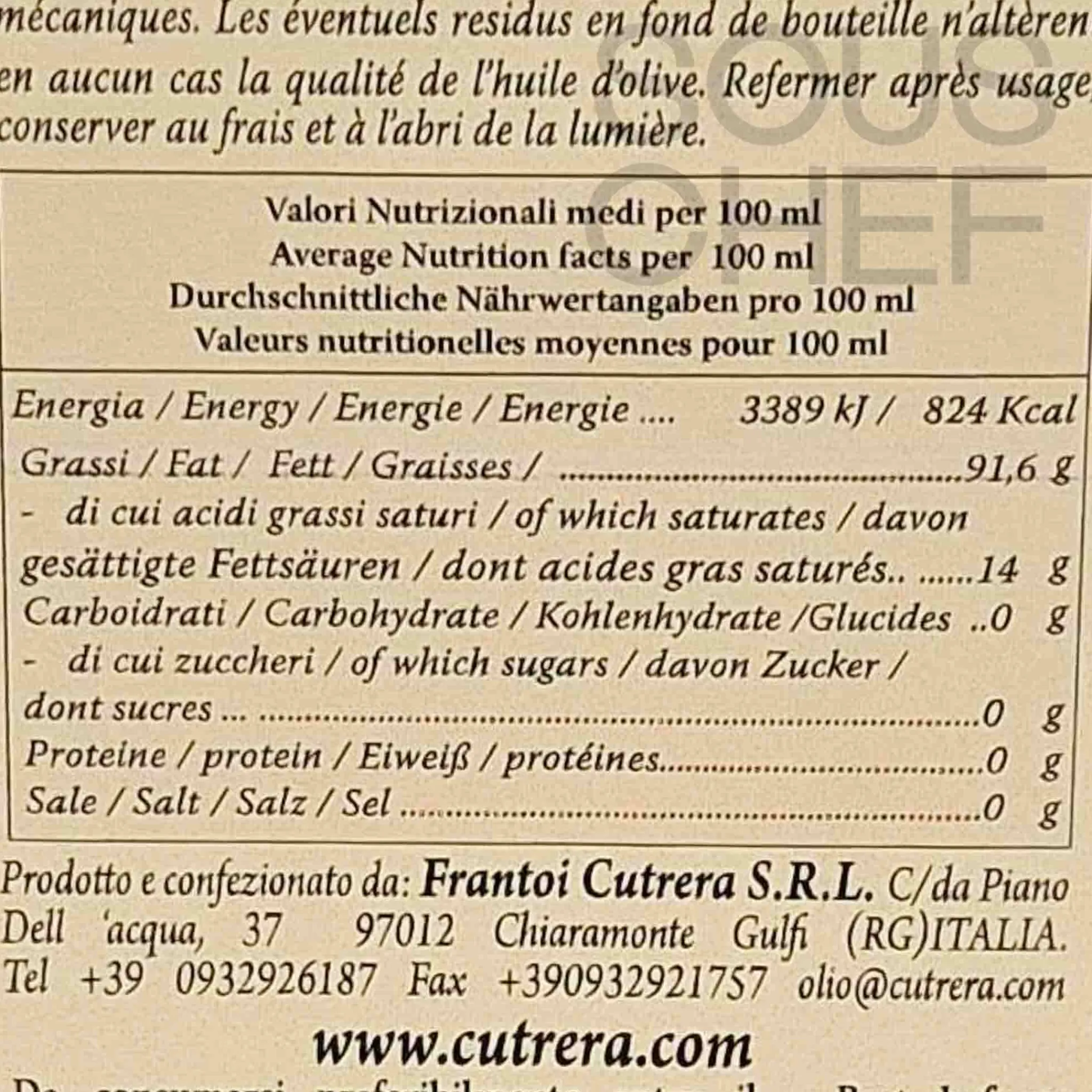 The oil is made from a blend of Sicilian olive cultivars. The Cutrera family grows native varieties like Nocellara, Biancolilla and Tonda Iblea. Once harvested, the olives are cold-pressed within a few hours.