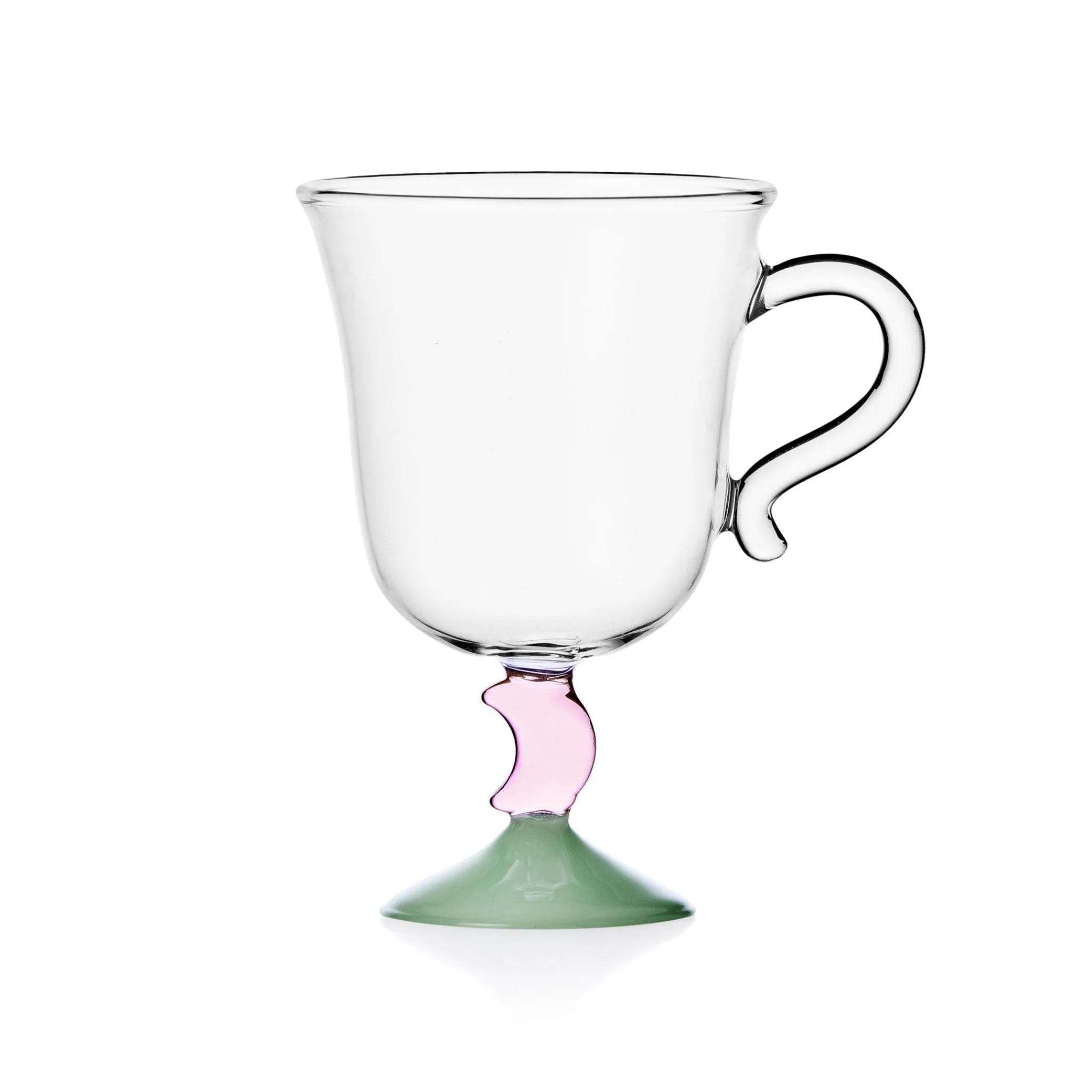 Sip spiced hot chocolate from Ichendorf Milano’s pink moon mug. Made from flame-worked glass, it has a transparent body and dark blue base. A pink crescent moon replaces the traditional handle.