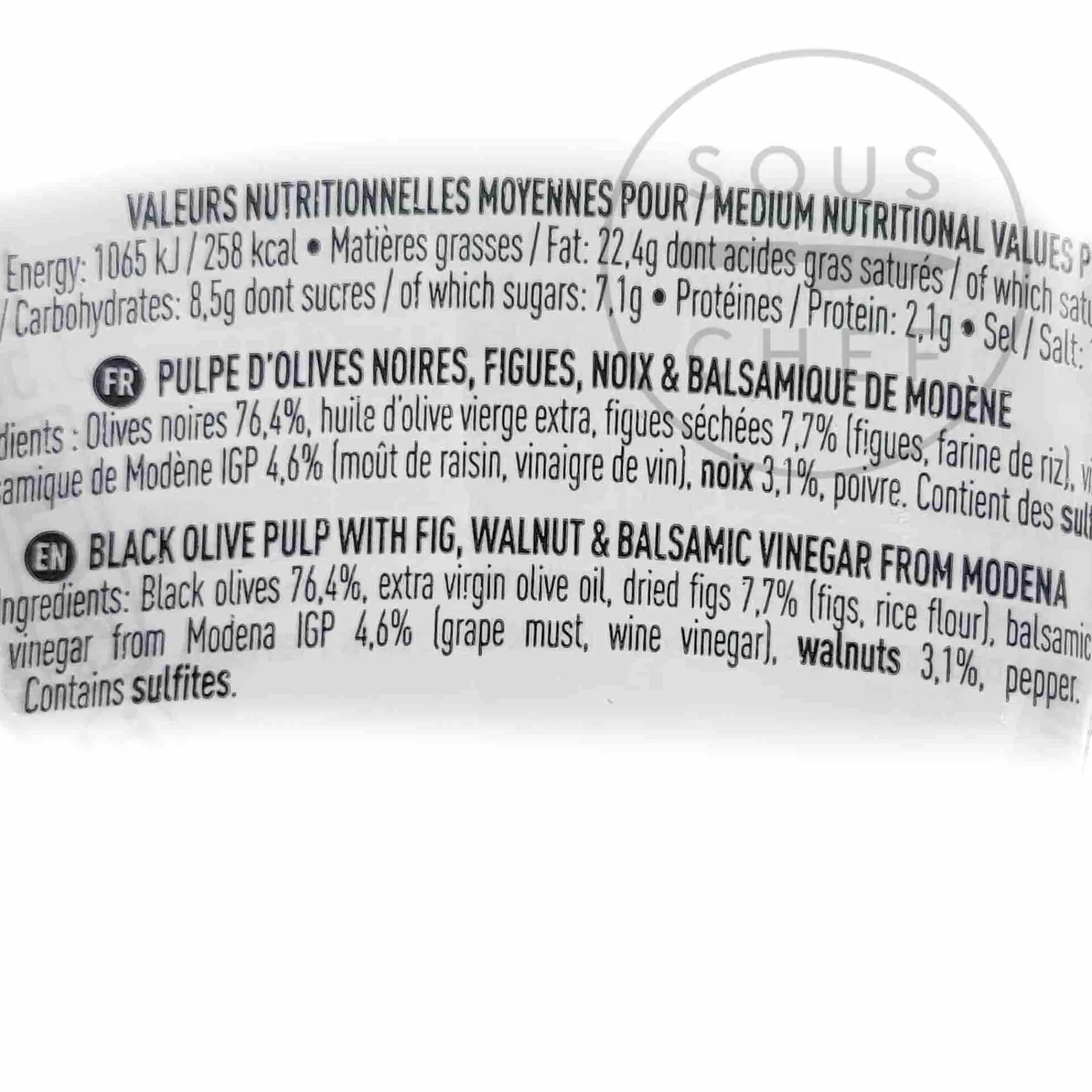 Product formulations and details may change. For the latest ingredients and allergen information always check product packaging prior to consumption. Ingredients: Black olives (Morocco) 76.4 %, extra virgin olive oil (Spain – olives from Spain) 7.7% , dried figs (Turkey) 7.7% (figs 90% (Turkey), rice flour 10% (Turkey)), balsamic vinegar from Modena IGP (Italy) 4.6-5% (grape must (Italy) 70%, wine vinegar (Italy) 30%), walnuts (Moldova, USA, France) 3.1%, pepper (1) (Vietnam, Brazil, Indonesia) <0.5%. Contains sulphites.