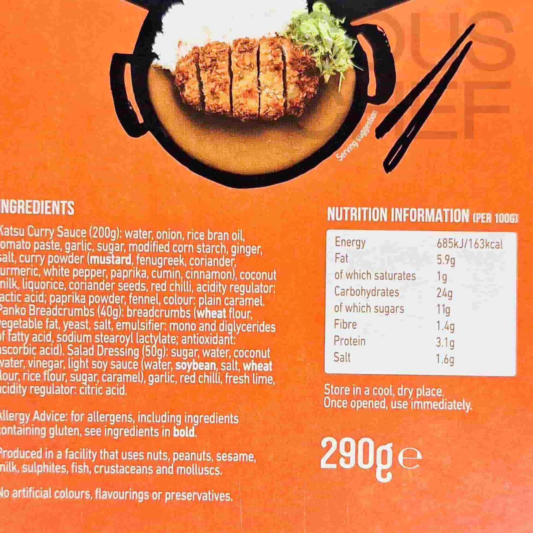 Product formulations and details may change. For the latest ingredients and allergen information always check product packaging prior to consumption. Ingredients: Katsu curry sauce (200g): water, onion, rice bran oil, tomato paste, garlic, sugar, modified corn starch, ginger, salt, curry powder (mustard, fenugreek, coriander, turmeric, white pepper, paprika, cumin, cinnamon), coconut milk, liquorice, coriander seeds, red chilli, acidity regulator: lactic acid; paprika powder, fennel, colour: plain caramel. Panko breadcrumbs (40g): breadcrumbs (wheat flour, vegetable fat, yeast, salt, emulsifier: mono and diglycerides of fatty acid, sodium stearoyl lactylate; antioxidant: ascorbic acid). Salad dressing (50g): sugar, water, coconut water, vinegar, light soy sauce (water, soybean, salt, wheat flour, rice flour, sugar, caramel), garlic, red chilli, fresh lime, acidity regulator: citric acid.