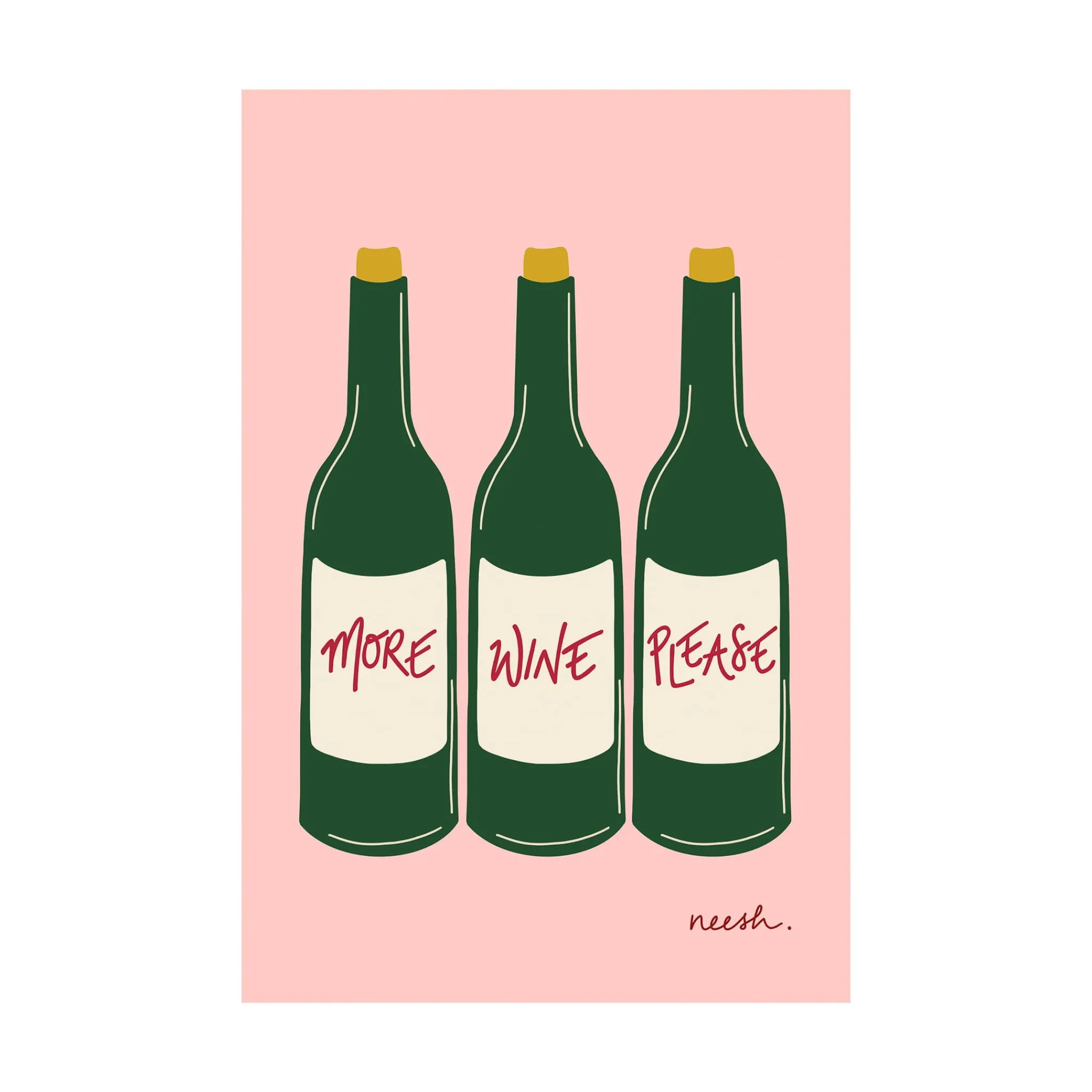 This wine-themed tea towel adds a splash of colour to your kitchen. It features hand-drawn green bottles against a hot pink background.