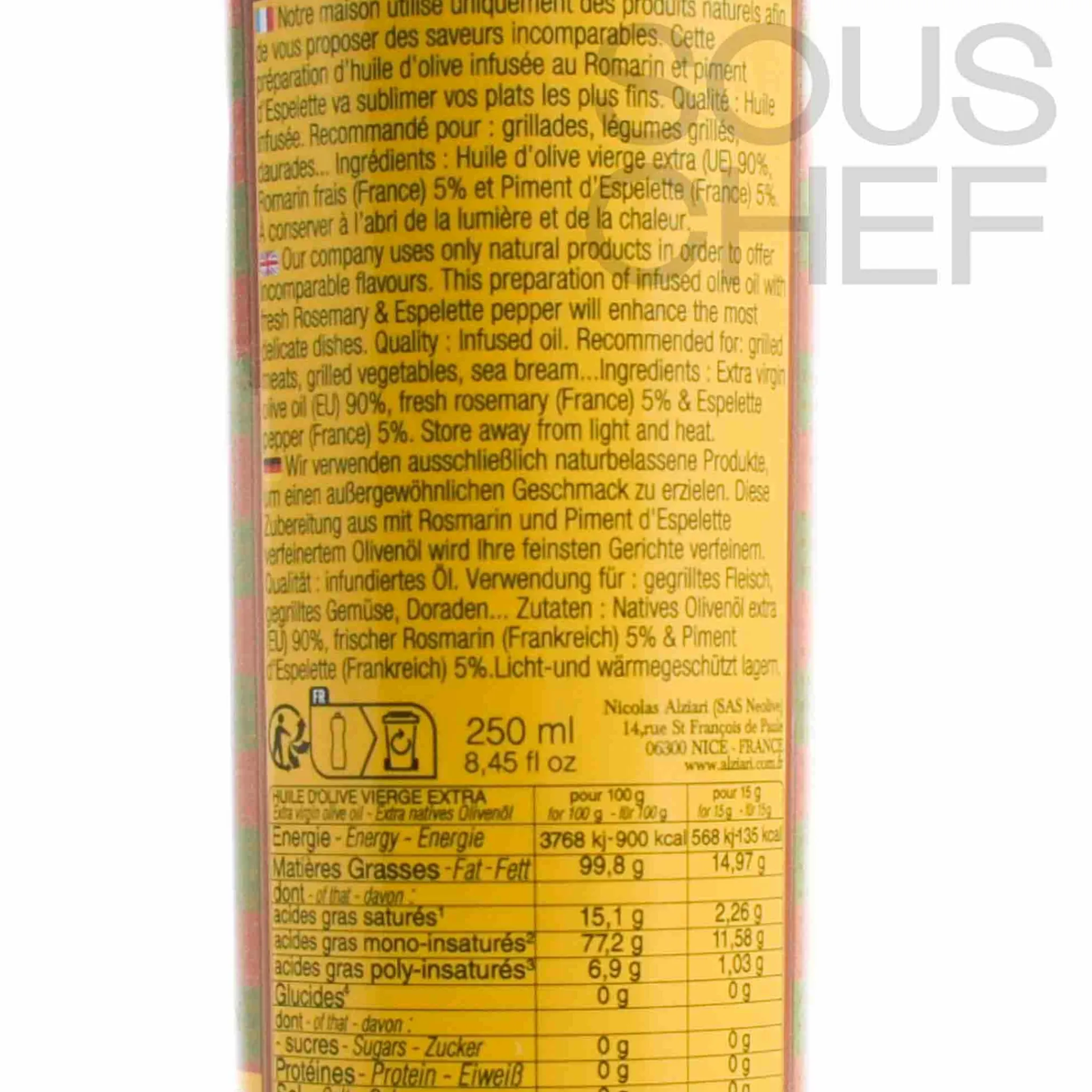 Product formulations and details may change. For the latest ingredients and allergen information always check product packaging prior to consumption. Ingredients: 90% extra virgin olive oil, 5% fresh rosemary, 5% espelette pepper