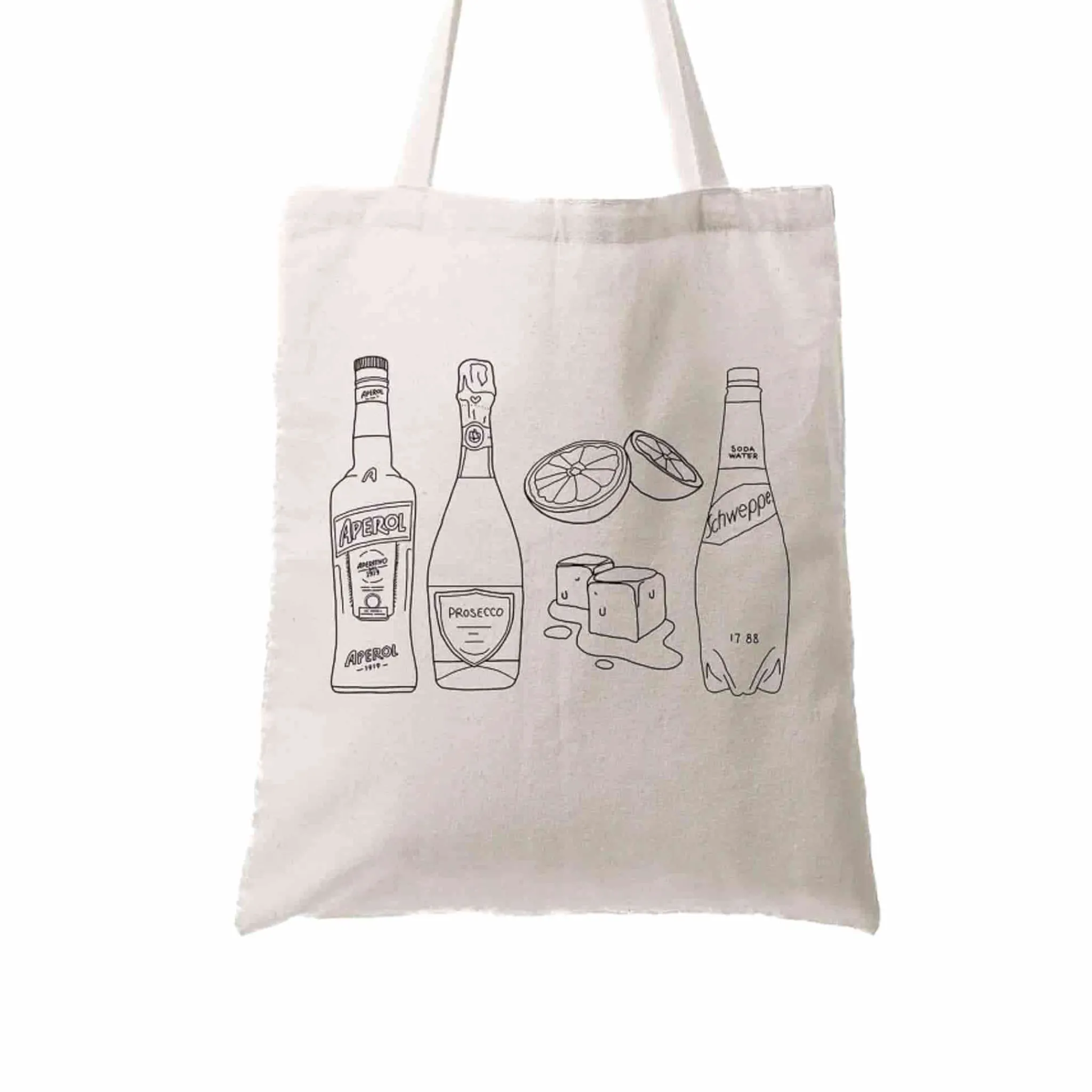 This Aperol spritz bread tote bag is the ideal accessory for cocktail connoisseurs and lovers of Italian culture. Made from organic cotton, it features hand-drawn illustrations of everything you need to make a refreshing spritz. Next to the bottle of Aperol, there is chilled prosecco, soda water, ice and sliced oranges. Use this playful tote bag to transport your spritz ingredients to the park for an al fresco happy hour.