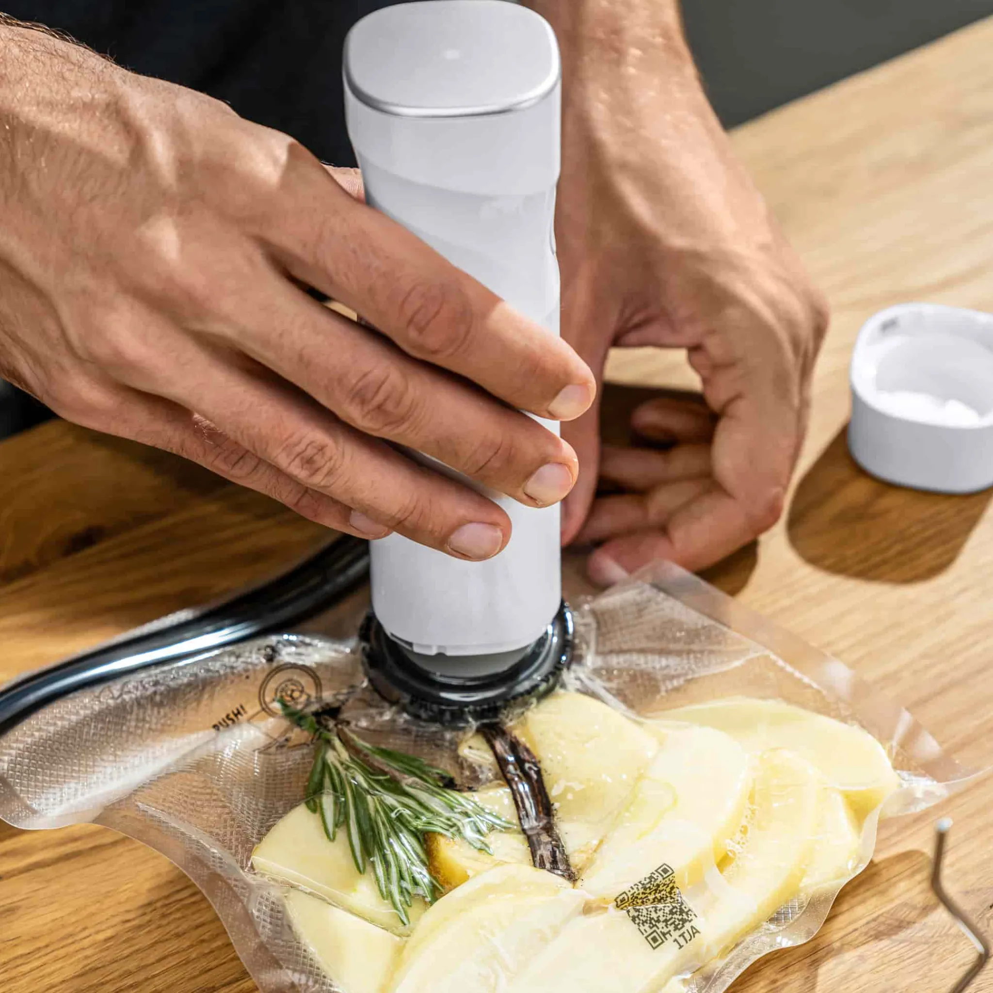 Available in two sizes, the airtight bags have a zipper closure. They can be used for freezing, marinating and sous vide cooking. To use them in a water bath, attach a vacuum pump and remove air from the bag in seconds. The bag is now sealed and can be placed in water.